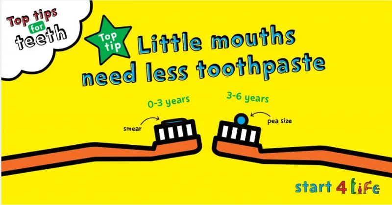 Fluoride is great for our teeth, but little mouths need less of it. For kids under three, use just a smear. For ages three – six, a pea sized amount will do.